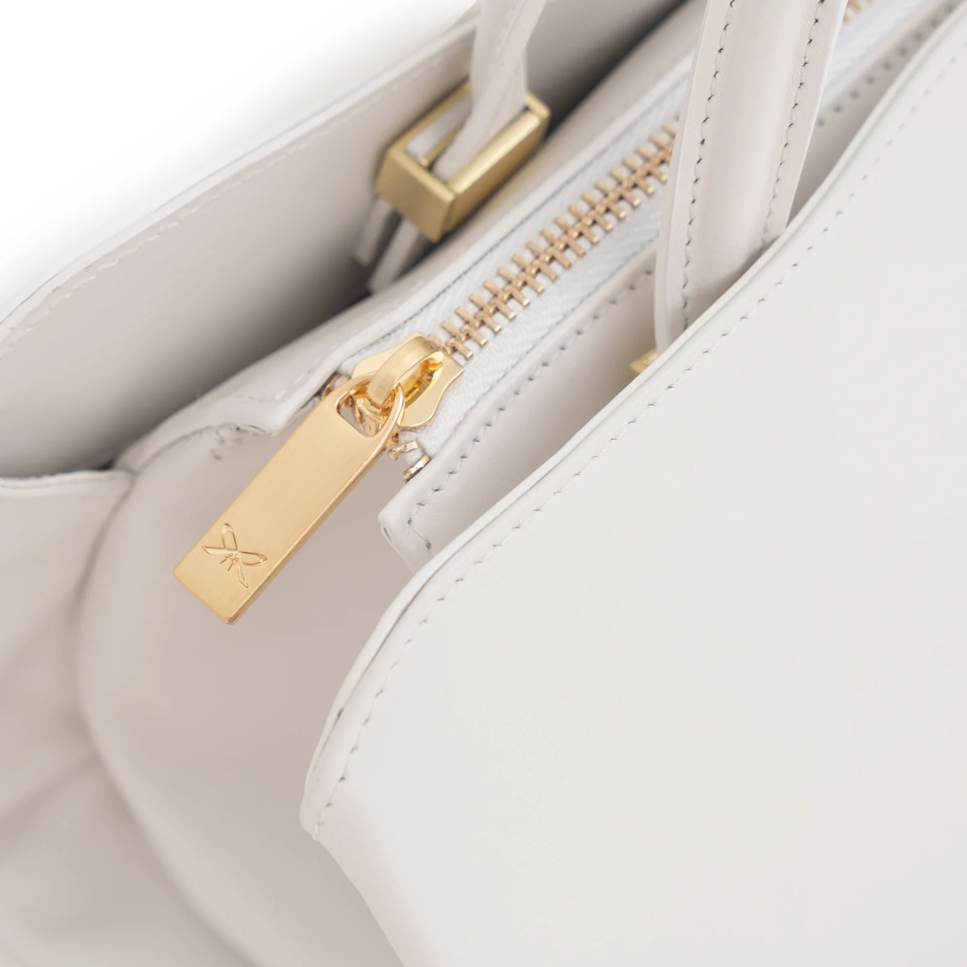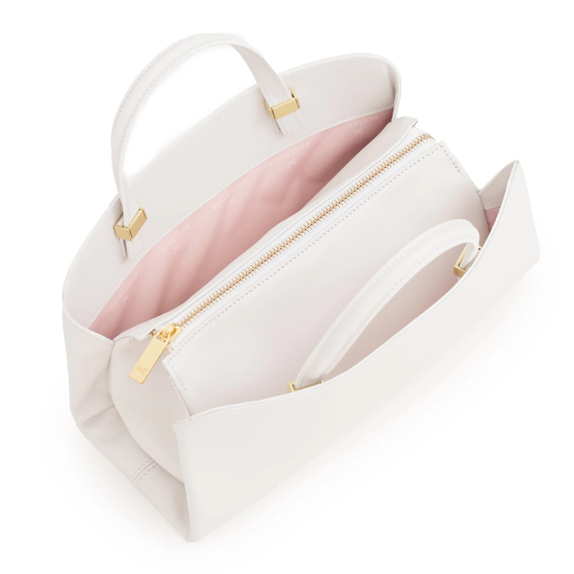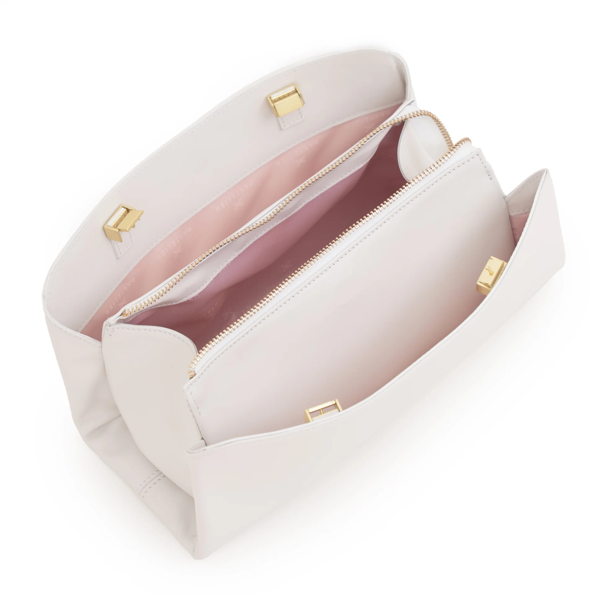 Wnętrze torebki kryje jedną pojemną komorę główną zapinaną na zamek, która pomieści najpotrzebniejsze przedmioty, a dwie boczne kieszenie zamykane na zatrzask zapewniają łatwy dostęp do drobiazgów.