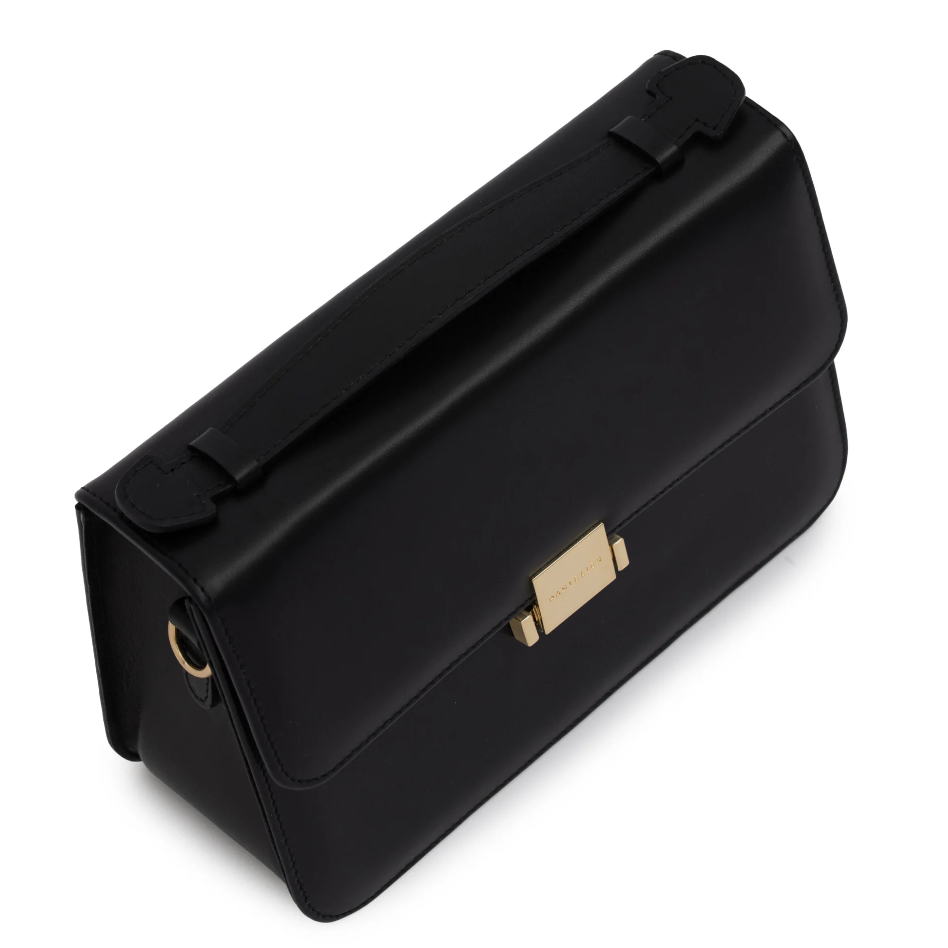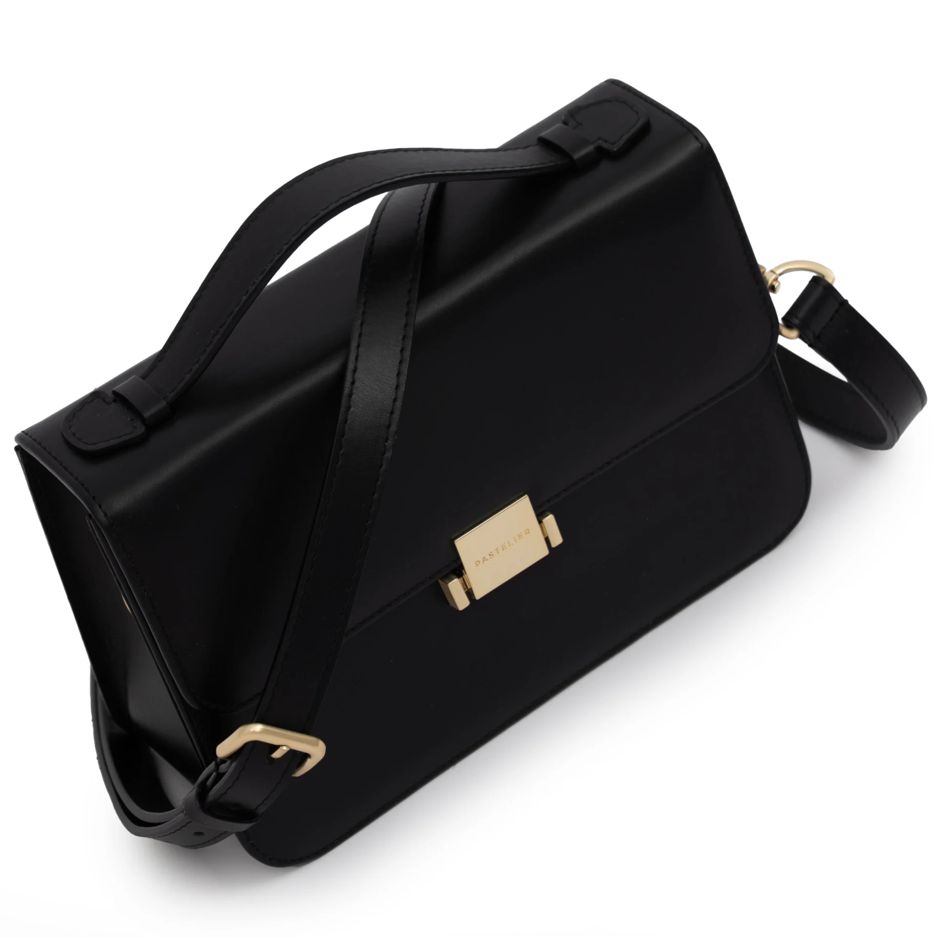 Materiał: licowa, włoska skóra naturalna Wykończenie w środku: materiałowa podszewka w odcieniu pastelowo-różowym z logotypem marki Okucia: szczotkowane szampańskie złoto Kolor: czarny Wysokość: 16 cm Szerokość: 23,5 cm Głębokość: 9 cm Dł. rączki: 20 cm Dł. paska: 95-110 cm Gwarancja: 2 lata