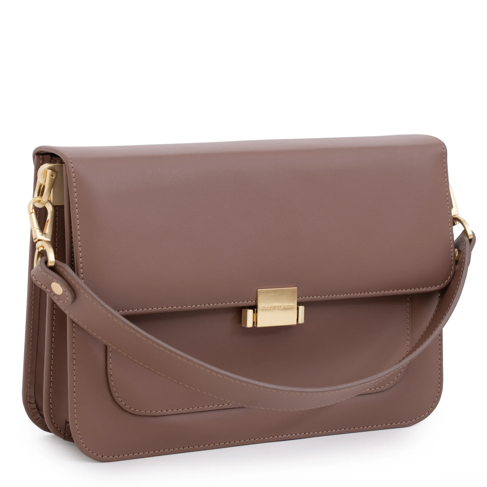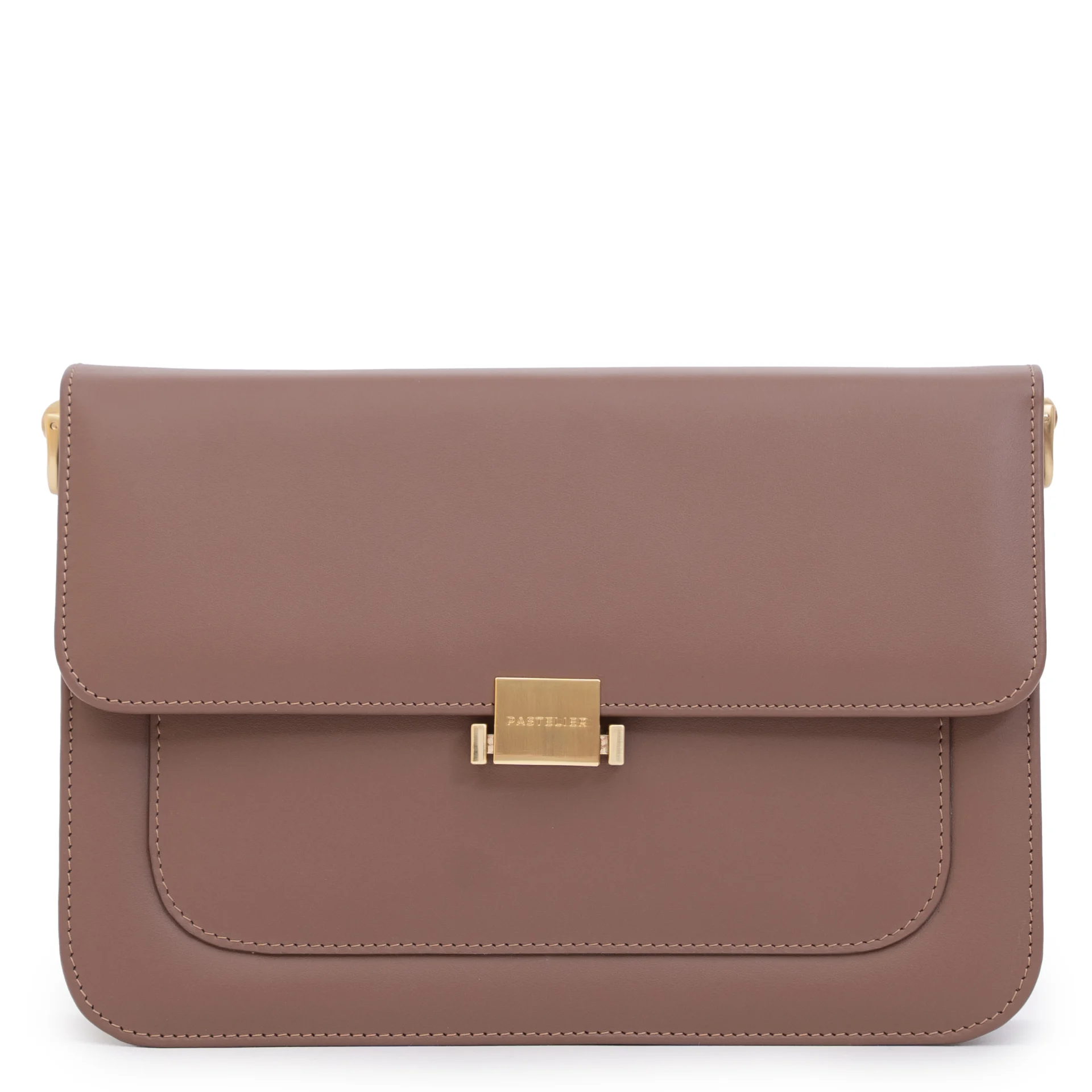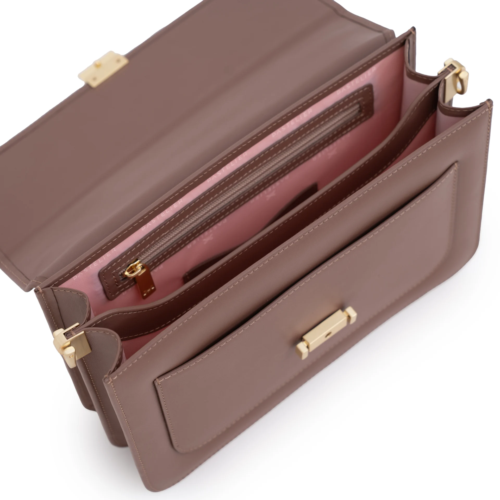 Całość dopełnia subtelna podszewka w pudrowo-różowym kolorze, dodająca modelowi kobiecego charakteru. Torebka wyposażona jest w dwa wymienne paski: regulowany, skórzany pasek z metalowymi okuciami w kolorze szampańskiego złota – umożliwiający noszenie na ramieniu lub crossbody – oraz krótką rączkę do noszenia w dłoni.