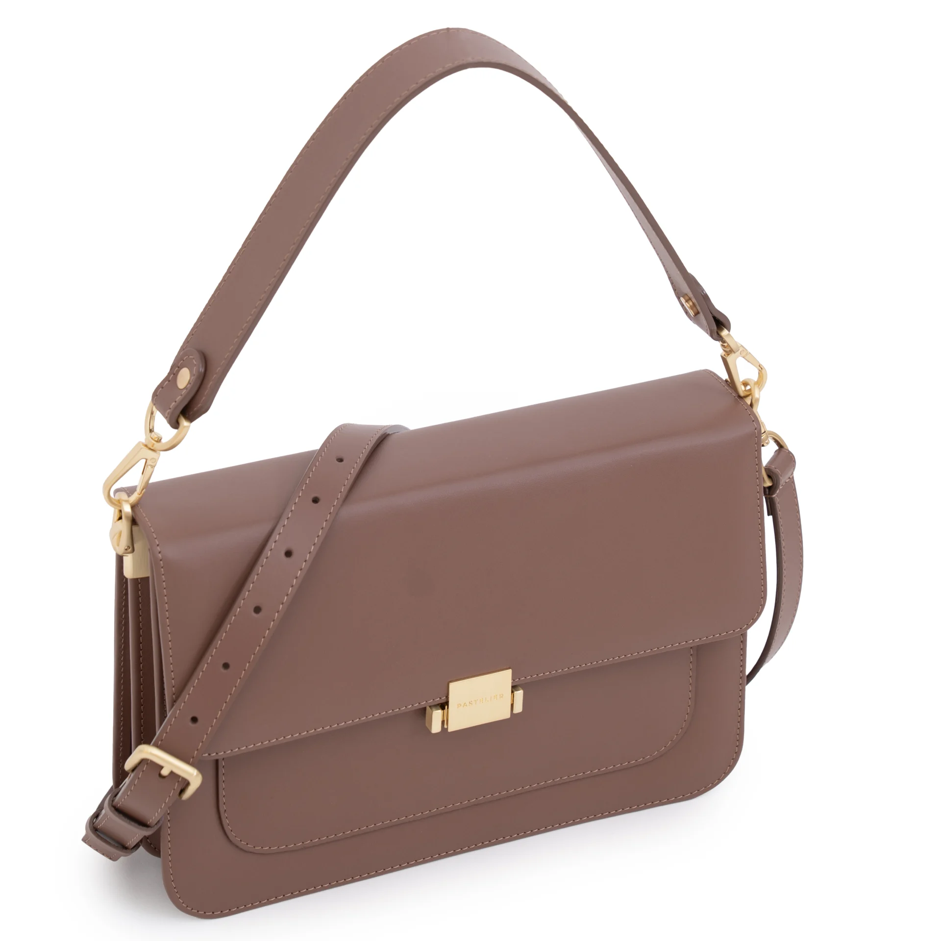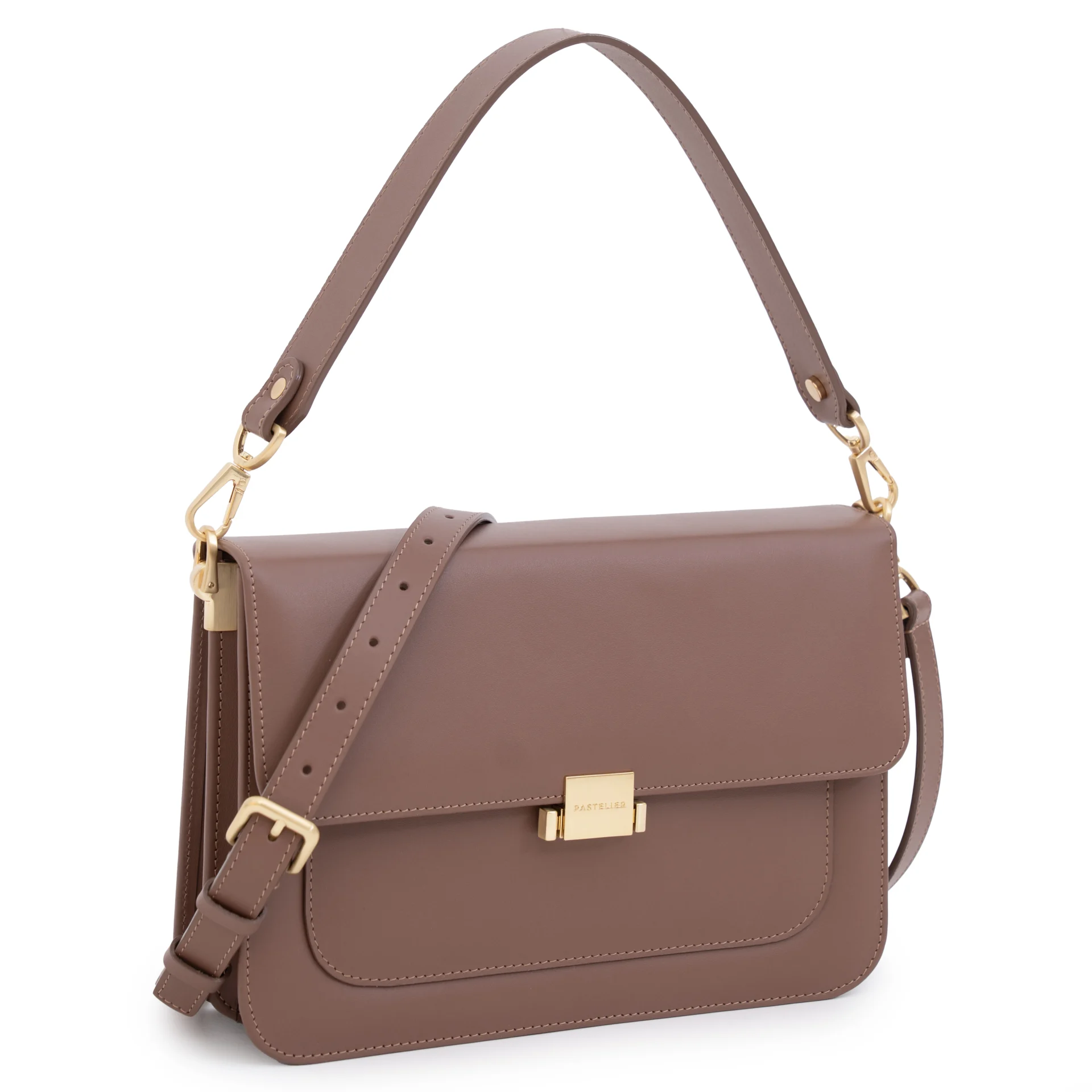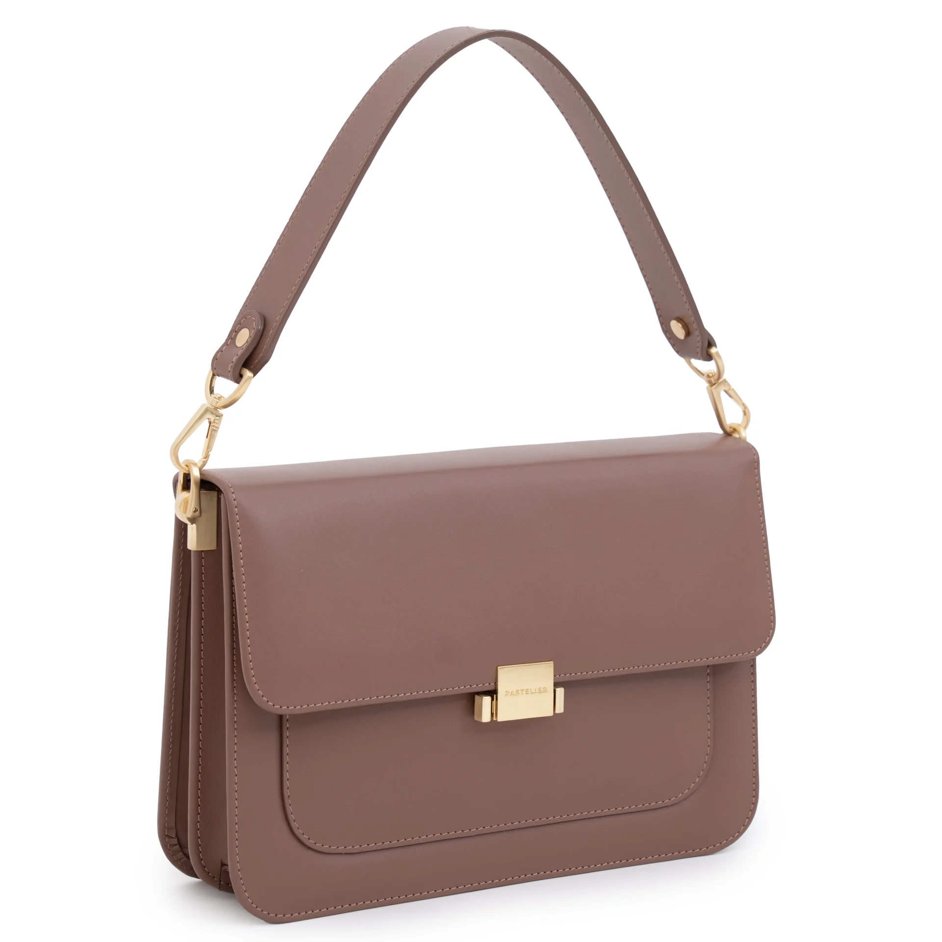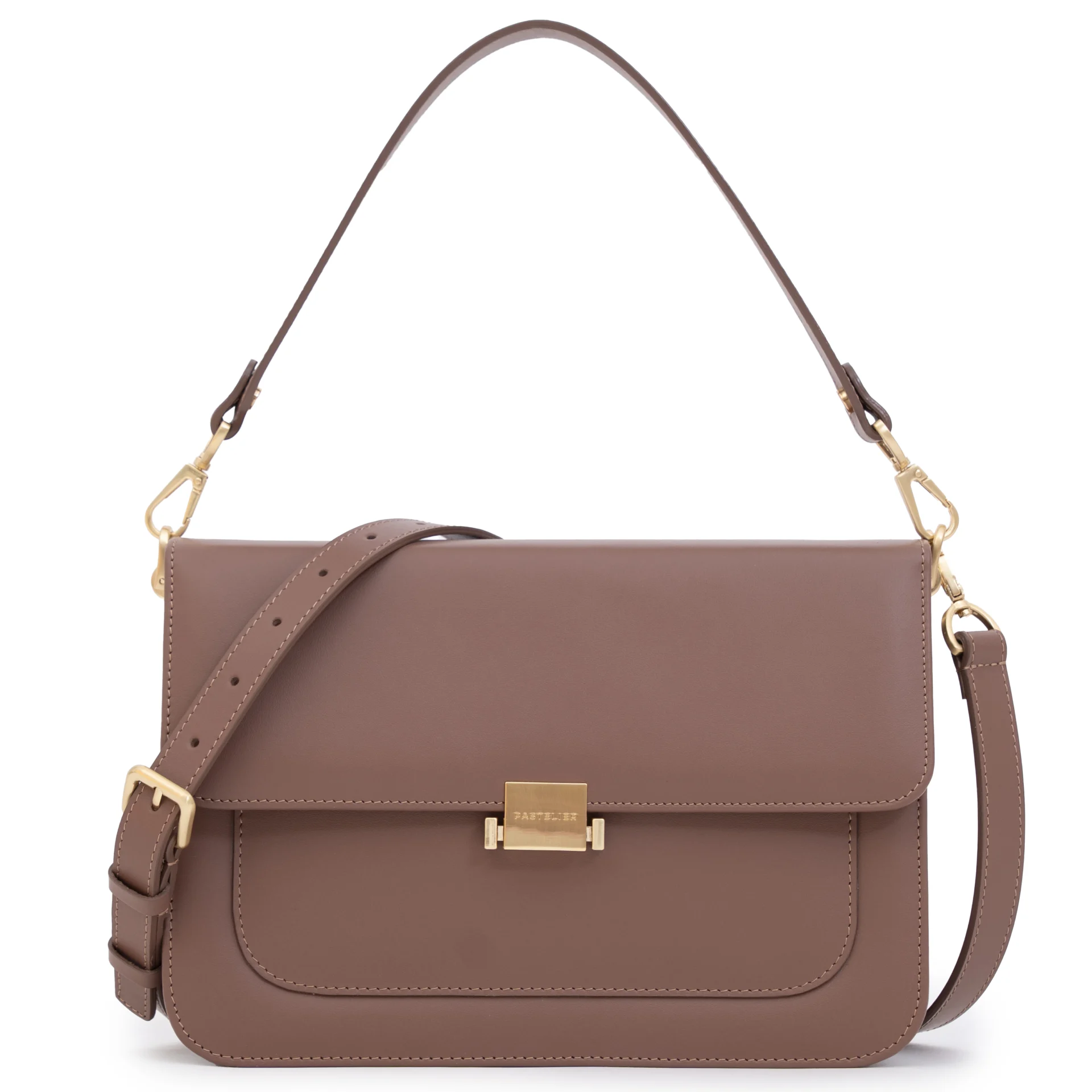 Całość dopełnia subtelna podszewka w pudrowo-różowym kolorze, dodająca modelowi kobiecego charakteru. Torebka wyposażona jest w dwa wymienne paski: regulowany, skórzany pasek z metalowymi okuciami w kolorze szampańskiego złota – umożliwiający noszenie na ramieniu lub crossbody – oraz krótką rączkę do noszenia w dłoni.