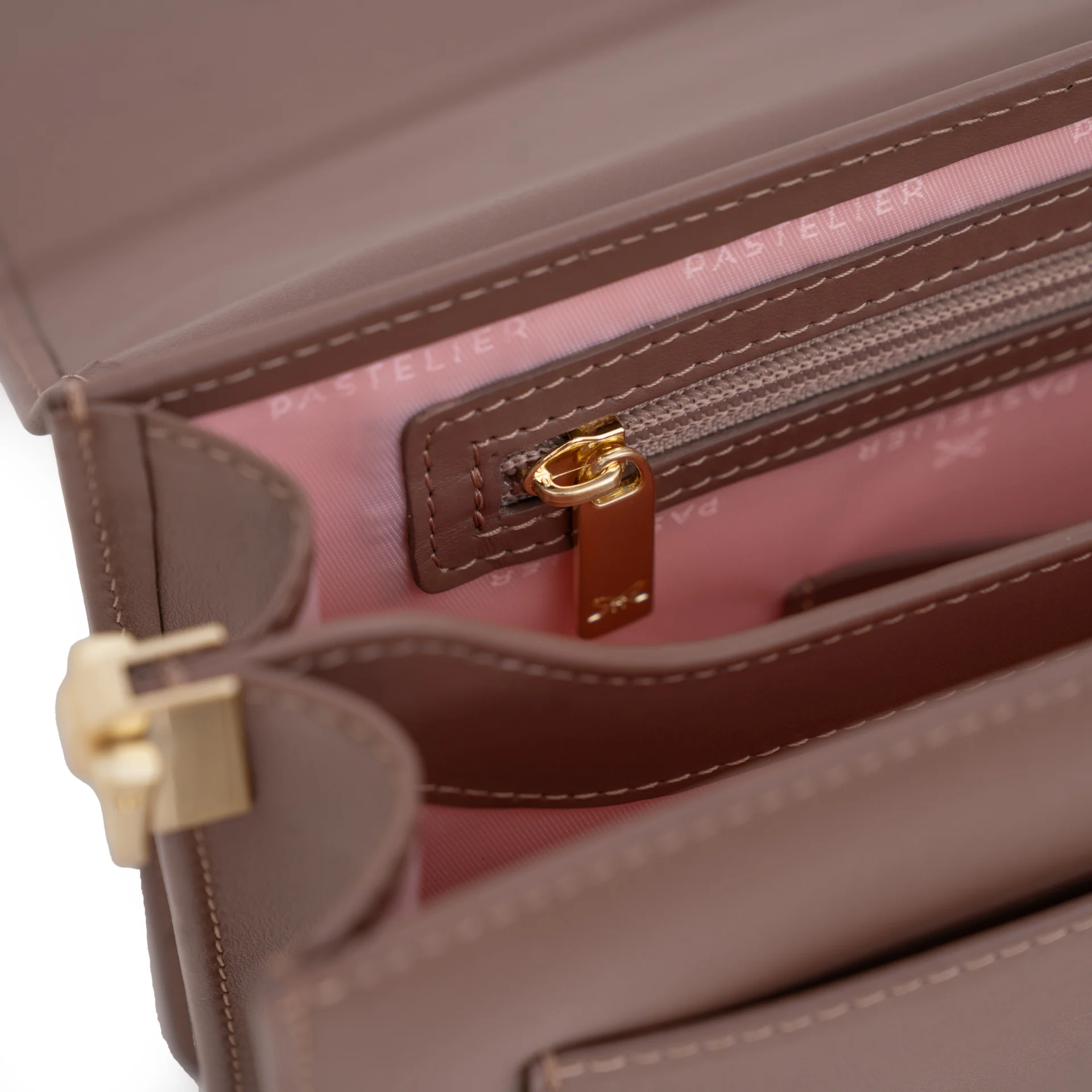 Wykończenie w środku: materiałowa podszewka w odcieniu pastelowo-różowym z logotypem marki